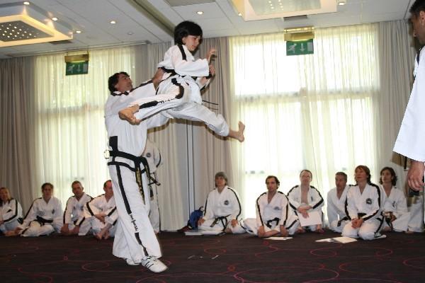 The sweaty bodies and red faces in white Dobok uniforms during hard training were transformed in the two hours break into relaxed and elegant ladies and gentlemen for the banquet. The fine attire and banquet atmosphere could have doubled for that hosted by George Clooney at a film festival in Cannes. The event made obvious that the seminar weekend was also a family re-union. The announcement that Master Isaac Harry was promoted to 8th Degree met with loud applause for the well-deserved honor. At age 64, seeing him in action side-by-side in training was truly an inspiration for all, especially the age seniors!