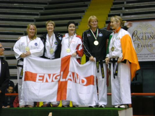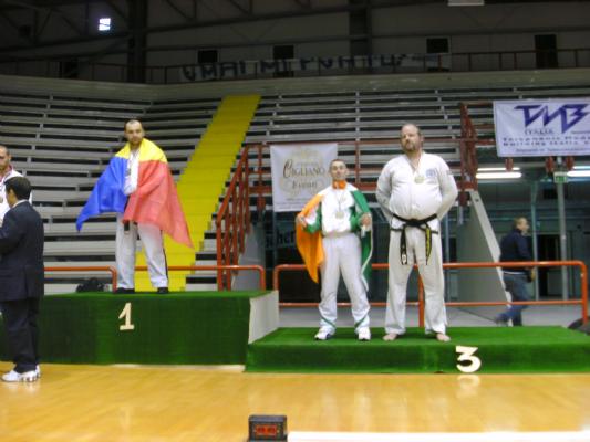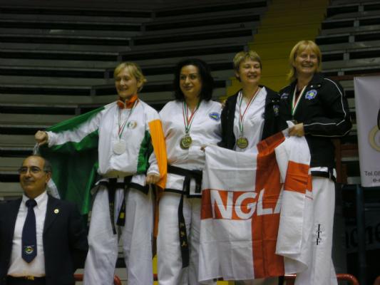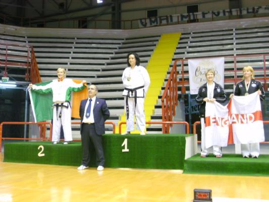 Irish I.T.F. instructors Mick Flaherty and Bernadette Doyle were Irelands representatives in the Senior (+35yrs) sections. Bernadette secured a Gold medal in Sparring after her opponent withdrew and then went on to take Silver in Patterns before getting a second Silver in the Power Breaking. Mick Flaherty also proved his metal with three exceptional performances in his sections. He secured Ireland's first Gold medal in 5th Degree Patterns ahead of Sweden and Team UK, then after beating Holland in the semi final he lost narrowly to Germany in the -64Kgs Lightweight Sparring section. With two medals in the bag Mick entered the Power Breaking as the lightest and smallest competitor but still managed to secure a Bronze medal behind Moldova and Bulgaria.