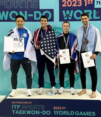 Despite the disappointment of patterns, the adults were fired up for sparring. Once again, this was going to be a different test, as there was only one round for each spar as opposed to two. Elliott was up first and although looking strong and finding his range against a much taller opponent from DR Congo, it wasn’t to be in the eyes of the judges. Noah Careford was making his debut in the Adult Heavyweight Category, using his excellent distance management and precise kicks and punches, he moved through his first 3 rounds against Poland, New Zealand and Argentina to set up his final later on in the day against another Argentinian live on ITF Sports TV.