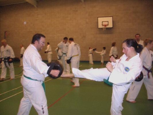 After a short break, everyone worked in pairs to drill some punching combinations, incorporating the foot work we had earlier rehearsed. Amongst the training members was Master Ian Lawes, 7th degree from Cardiff. Master Maidana kindly drew this to the attention of all present, pointing out Master Lawes’s humility to be training alongside all other students.