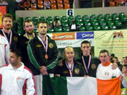 Not to be outdone the second member of Imperial Ireland John O'' Connor, put in performances which were truely outstanding. In Individual Patterns section John beat competitors from Sweden and Scotland before bowing out in the pool finale to Italy. In the Individual Sparring section John was in the hotly contested -75kg catagory and he stopped his first opponent from the U.S.A. in round two. He then took a points decision over a Croatian. With only a three minute break before the next bout John just lost out to a very strong Argentinian by a 5 point margin and again in the pool finale, which unfortunately was just short of a medal. However, John did secure a place on the podium that was thoroughly deserved when the Male Power team smashed their way into the Bronze medal position.