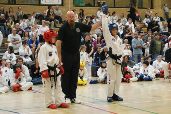 The challenge kicked off with the adult black belts giving a great display of team patterns. The day progressed well with many degree students competing & then swiftly getting changed into shirt & tie to help with umpiring. With their assistance we managed to open up all four rings & the competition got into full swing. The younger student’s age ranging from 5-8years then were able to put into practice what they had learnt with their instructors & show their skills to the crowd. As the competition drew to a close the black belts attempted to break as many boards as they could in the power test & the final points were totalled up to give the best overall club trophy results. Master Nicholls was then on hand to present the trophy to Mr Grant Churchward of Paignton TKD with an impressive total score of 142. The competition then drew to a close at 4.30pm; the student s & spectators were delighted with an early head start on their way home from a hard days work.