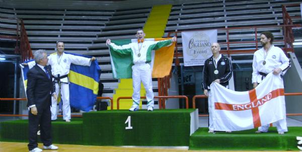 Irish I.T.F. instructors Mick Flaherty and Bernadette Doyle were Irelands representatives in the Senior (+35yrs) sections. Bernadette secured a Gold medal in Sparring after her opponent withdrew and then went on to take Silver in Patterns before getting a second Silver in the Power Breaking. Mick Flaherty also proved his metal with three exceptional performances in his sections. He secured Ireland's first Gold medal in 5th Degree Patterns ahead of Sweden and Team UK, then after beating Holland in the semi final he lost narrowly to Germany in the -64Kgs Lightweight Sparring section. With two medals in the bag Mick entered the Power Breaking as the lightest and smallest competitor but still managed to secure a Bronze medal behind Moldova and Bulgaria.