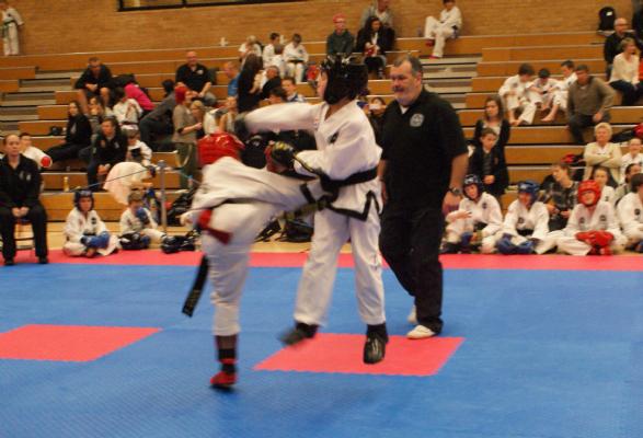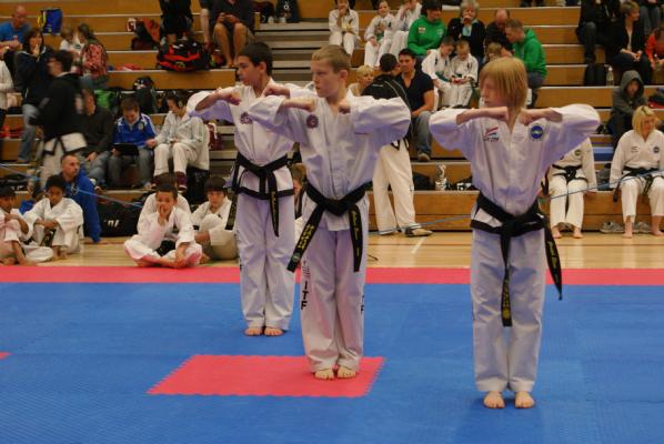 Patterns got underway promptly and Megan, Lucie and Esme earnt silver to get the first medal for SGTKD. The boys soon followed with silver for Ben C, Kieran and Ollie and gold for Joseph, Ben BA and Callum. This was a real achievement as Callum had only been awarded his first degree black belt three weeks earlier. Phoebe, Rae-Ann and Chloe earnt bronze and the "old" ladies Renitha, Sarah and Laura got silver.