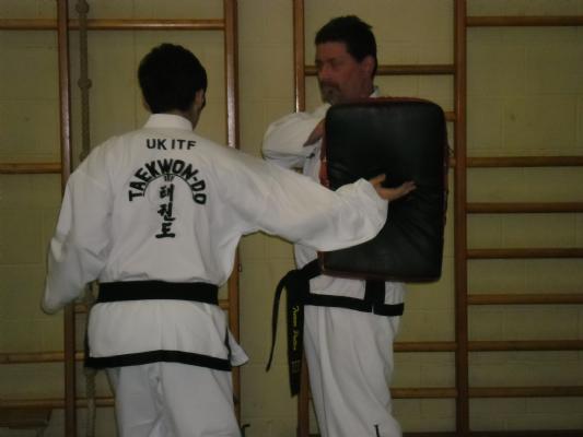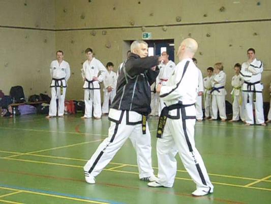 At 10.30 it was time for the Seminar. Over 40 students of all ages from white belt to 5th Dan watched Master Nicholls demonstrate the importance of hip twist to generate power and fluidity in hand techniques. This was then practised in pad work. With sore arms and shoulders developing Master Nicholls moved on to Turning Kick and Side Kick.