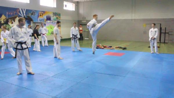 The adult session was underway by 11:30. Throughout the stretching session, Mr Gassor gave key tips on how to improve gradually, highlighting common stretching mistakes and how to keep motivated. Some fantastic methods of improving balance, leg control and speed were tried and tested by the group – if any drill was too easy, you could guarantee Mr Gassor could make it harder and harder so that everyone was pushed to their limit! The group was split up into teams according to skill, and an element of competition was thrown in as we tried ‘the add on game’. Combinations of kicks were built up until one person in the group couldn’t perform some of the kicks – this was a really good way of discovering which kicks work well consecutively.