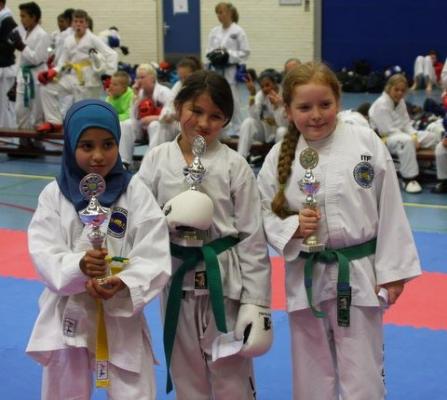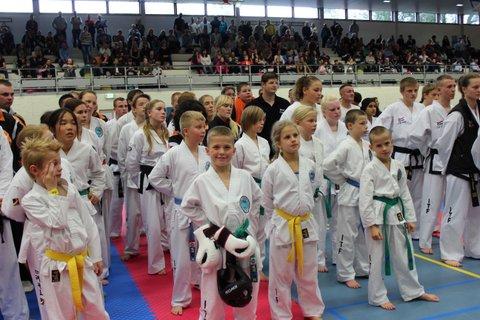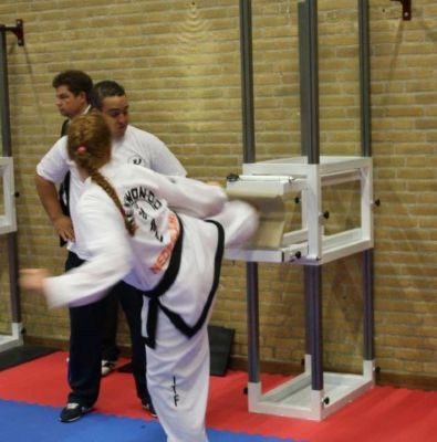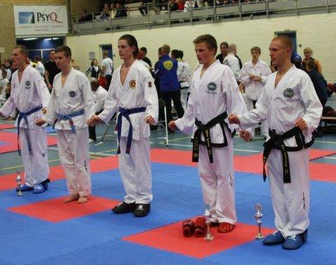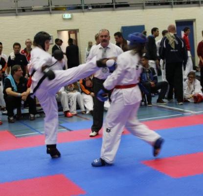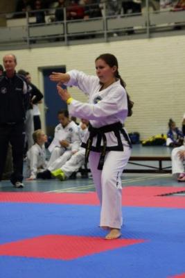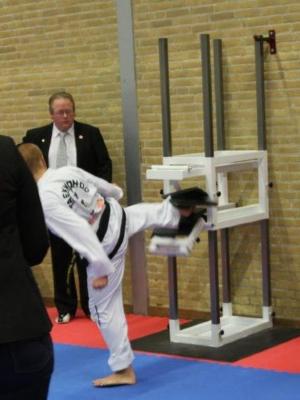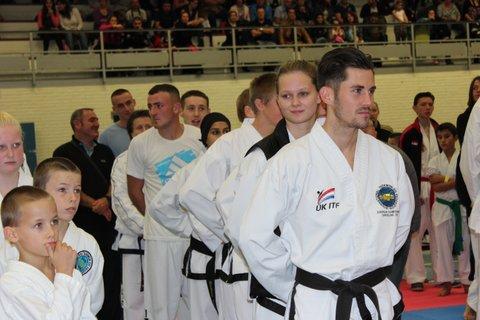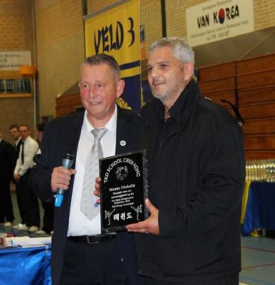 Master Nicholls then proceeded to hand out 2 prizes, one to the youngest competitor (6 years old) and one to our oldest competitor (68 years old). His short speech that followed was very inspiring and lifted the spirits of all Taekwon-Do minded people in the building. After this speech, we greeted and rapidly got on with the competitions. This had been a very special moment during the day and we are very proud of this.