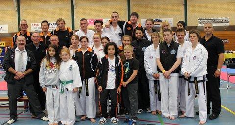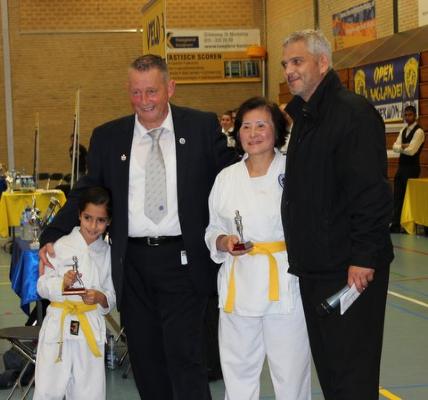 Master Nicholls, who has the 8th dan degree, the Secetary General of the ITF Grandmaster Choi Jung Hwa organisation and president of UK ITF would arrive at the tournament a little later due to his prior obligations at a seminar and black belt degree exams in the UK. When he arrived at Schiphol airport, Ella Zondag and Ronald Vielvoije were there to meet and welcome him and take him to the Open Haaglanden. When he arrived the tournament was stopped to properly welcome Master Nicholls. We were very honored with this special guest and Master Nicholls was given a small token of our appreciation. For most of the competitors the arrival of Master Nicholls was a very welcome surprise.