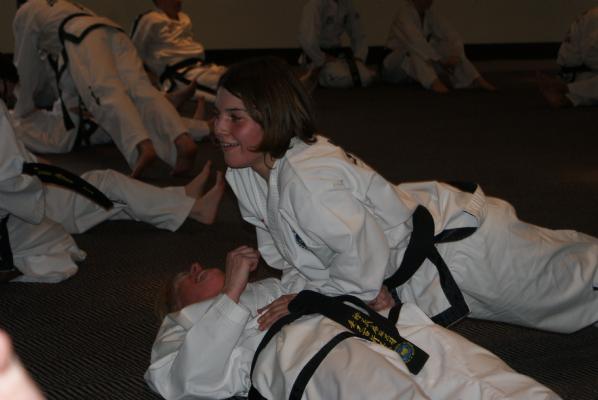 After a brief stop for lunch we split into a couple of groups and Miss Burridge took us through some patterns focusing on the correct technique, power and speed of moves. It was great to have the opportunity to see some of the higher grades gathered together and performing their patterns. You could almost hear the Stoke Gifford student’s hearts sink when Miss Burridge mentioned the leg strengthening exercises that would follow and true to her word she put us through the side kick holding, circling, pulsing and side to side exercise! Miss Burridge and Mr Rauli took to the floor and showed us Tong Il tul.