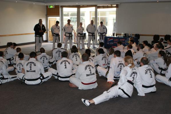 Later on we headed back down to attend the evening meal and awards presentations. Whilst we wined, dined and chatted amongst ourselves and with our UKITF friends, photos of days training were shown on the big screen. The three course meal was soon followed by the National and Regional Awards during which Miss Burridge was presented with a champagne glass set as an appreciation for all her hard work as chair of the Coaching and Tournament Committee. Kieran McDermott was awarded the Overall Region 7 Competitor for 2013 and Emily Oakes, who has recently joined the club, was presented with a Recognition of Dedication award.
