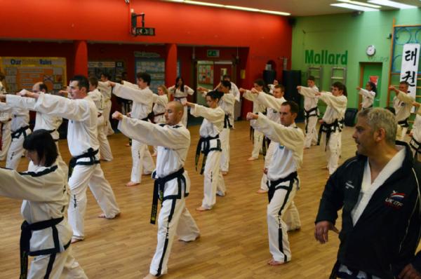 Saturday morning brought a packed hall of CITKD students warmed up and ready, at 10 am Master Nicholls started, focusing the session around defining the difference in application of kicks e.g. Technical and sparring, also clearly emphasising the correct foot pivot through Turning Kicks, Side Turning Kicks, Front Kick and Side Front kicks. He explained the technique and the importance of the foot pivot, with the students soon clearly demonstrating a Turning Kick with a foot pivot angle of 45°and a Side Turning Kick with a foot pivot angle of 75°. The Front Kick and Side Front Kick separated full-front stance of a normal Front Kick and introduced the effectiveness of planting the rear foot for a Side Front Kick and only rotating the front leg during the progression of the kick (which is seen within Joong-Gun Tul).