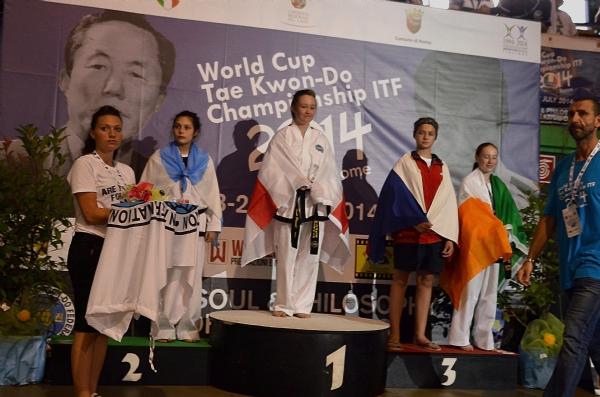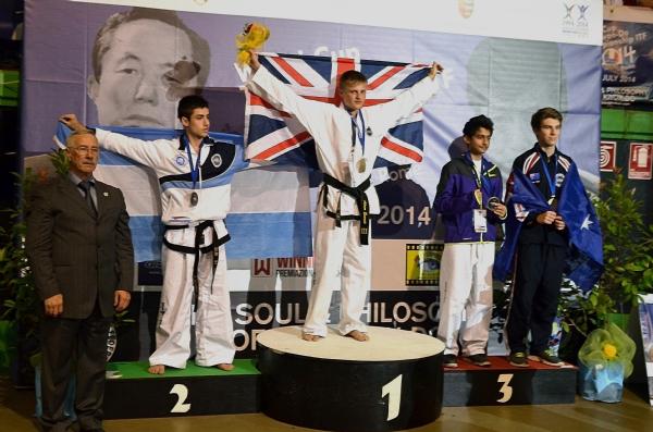 Then Adam Everett was up in the Heavy weight Junior Male division which is always a fiercely competative category. He fought the first round very bravely against a very good Irish competitor and then several more rounds until he won through to the final against a student from Australia who was a very worthy opponent, however Adam proved too strong and took the Gold !!! Double World Champion.
